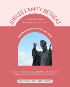 You are invited to join us at Mary Our Queen for our Family retreat day where our DRE, Leigh Anne Butrum, will share details of her jubilee pilgrimage to Rome, the graces that were found in personal prayer and your intentions that she carried, and share about some ways that our late Holy Father intended for us to live into this Holy Year. It would be a blessing to share this with all of you, and anyone else who might be blessed by it, how the Lord moved in my own life through this pilgrimage and the jubilee year, and invite you and your families to join me in taking an afternoon to pause and to pray. Here is a quick snapshot of the day –