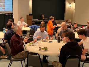 The flow of each evening is simple: there’s dinner, games, teaching, discussion, then challenge and prayer. Fraternus meets on Wednesdays in St. Joseph’s Hall beginning with dinner at 6:30 PM and concluding after Compline at 8:30 PM.