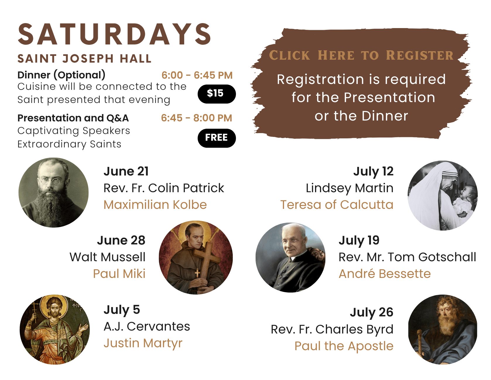 Even if you are unable to join us for dinner, each evening promises to be enlightening and engaging, offering valuable insights into the lives of these holy people. Don’t miss this opportunity to explore the rich tapestry of sainthood through the eyes of our knowledgeable and passionate speakers.